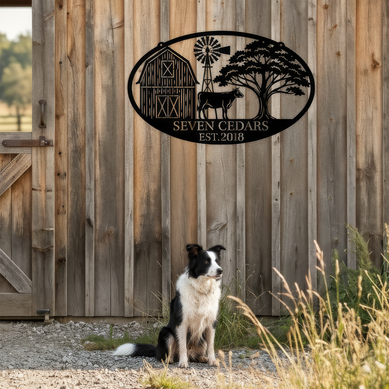 We laser-cut a classic farm scene into thick, heirloom-grade steel. Built to beat sun, wind, and rain for years. It stands proud at the barn entrance, mudroom, or any space that honors rural living.